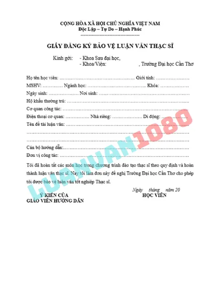 Để có thêm thời gian hoàn thiện luận văn thạc sĩ tại Đại học Cần Thơ, bạn cần nộp mẫu đơn xin gia hạn bảo vệ luận văn. Dưới đây là mẫu đơn đơn giản và dễ điền, giúp bạn hoàn tất thủ tục gia hạn đúng quy trình và đảm bảo được yêu cầu từ trường.
