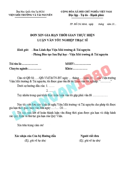 2.4. Đơn xin gia hạn bảo vệ luận văn thạc sĩ Viện Môi trường & Tài nguyên TP.HCM