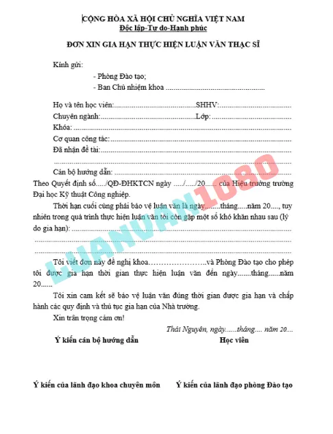 Để xin gia hạn bảo vệ luận văn thạc sĩ tại Đại học Kỹ thuật Công nghiệp Thái Nguyên, bạn cần nộp mẫu đơn xin gia hạn bảo vệ luận văn. Mẫu đơn dưới đây sẽ hướng dẫn bạn điền thông tin một cách đầy đủ và đúng quy trình, giúp bạn được gia hạn thời gian bảo vệ luận văn.