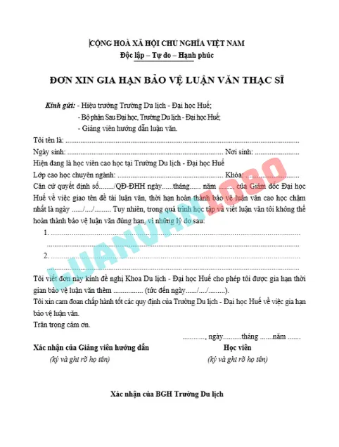 2.6. Mẫu đơn xin gia hạn bảo vệ luận văn thạc sĩ trường Du lịch – Đại học Huế
